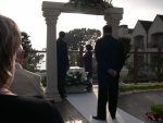 The minister, Reverend Eric Bourdette, the groom, and the groomsmen file in.