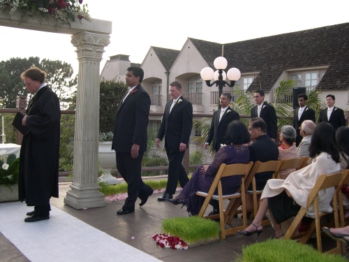 The minister, Reverend Eric Bourdette, the groom, and the groomsmen file in.