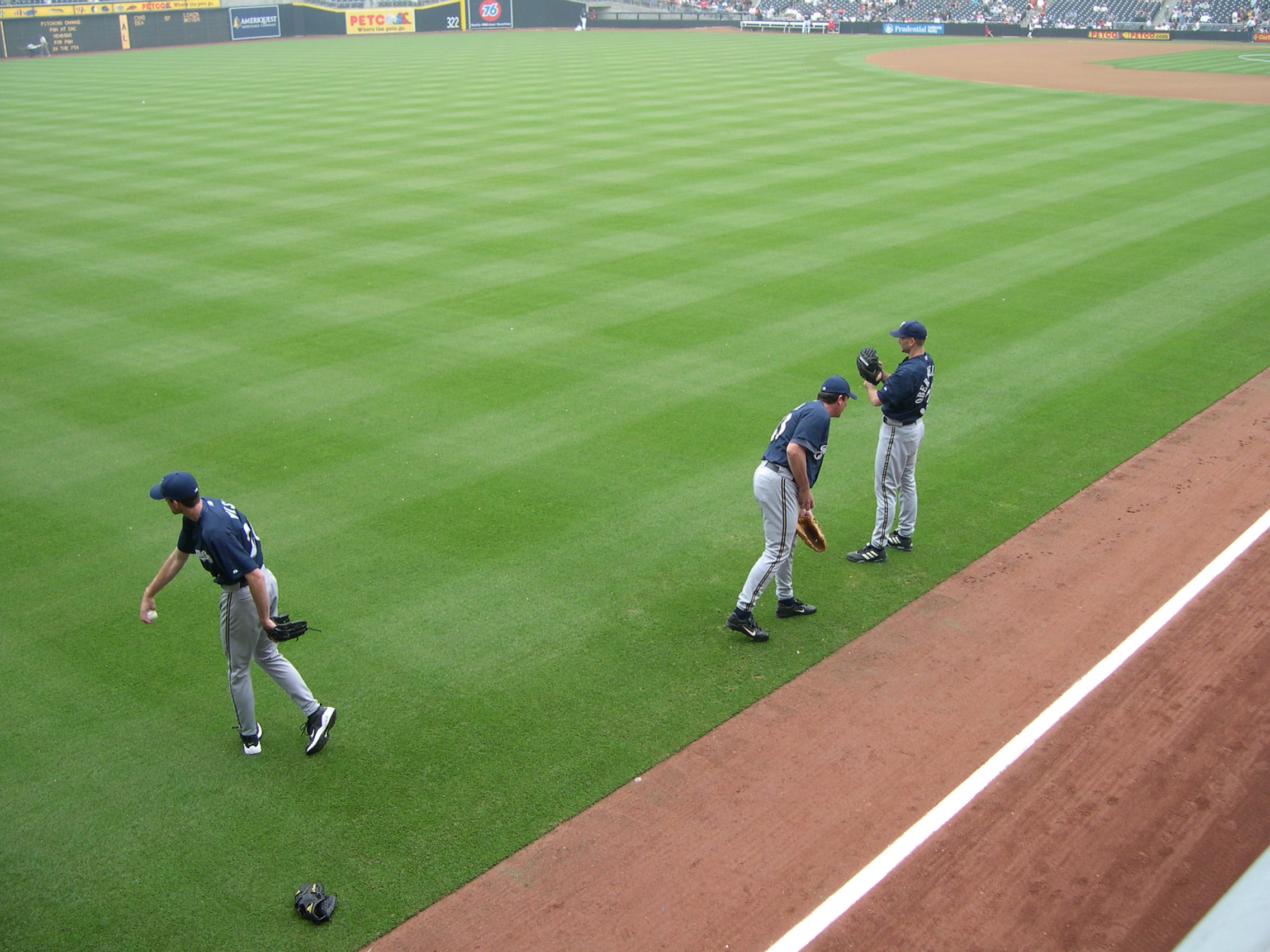Matthew Wise, Dave Burba, and Wes Obermuller warming up before the game.