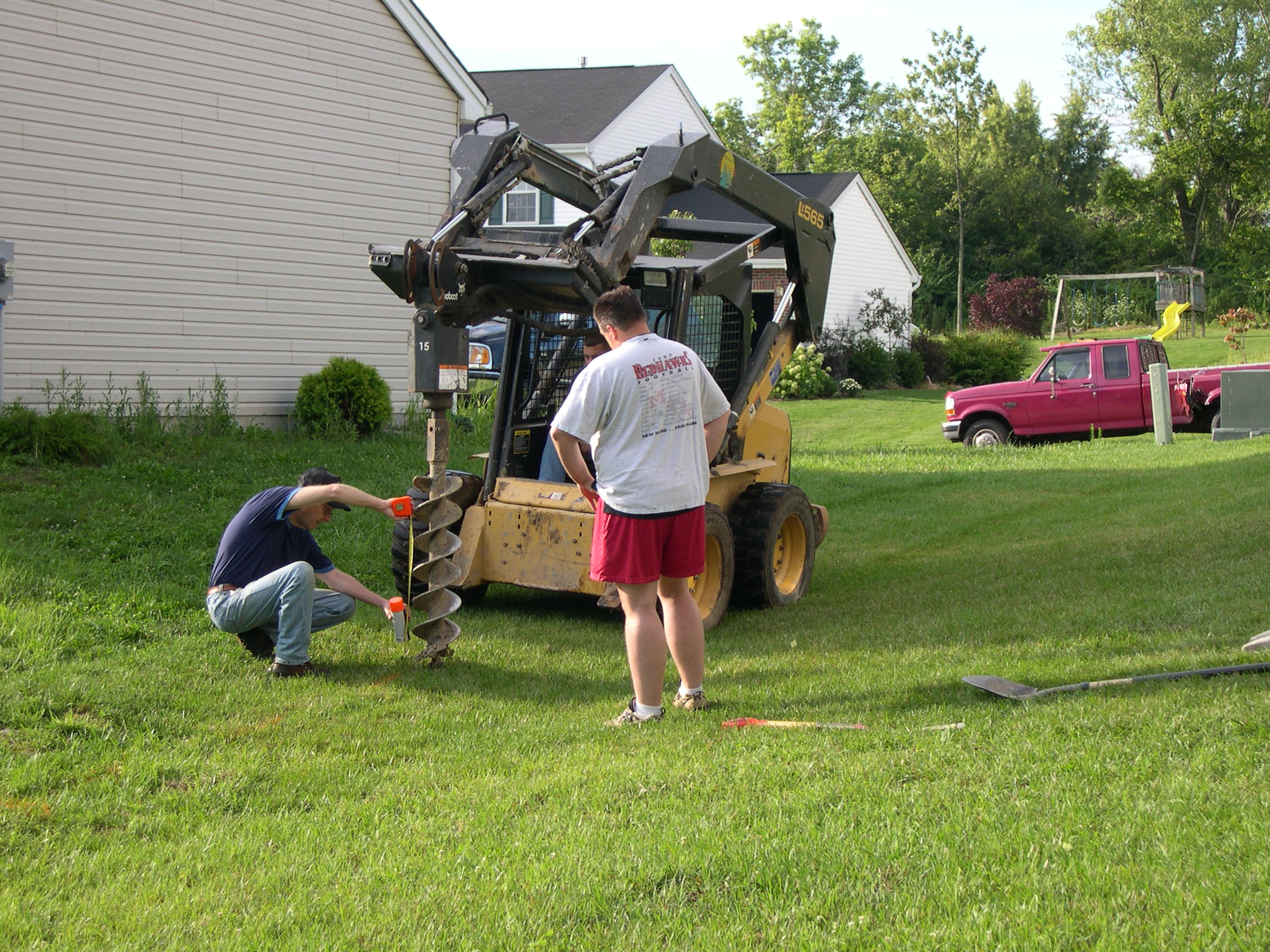 Stacey's Dad marks the depth on the auger for the post holes (two feet deep).