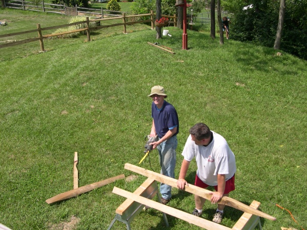 Stacey's Dad shaves rails while Andrew holds them in place.
