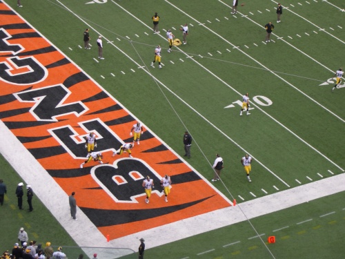 Offensive line warm-ups were closest to our seats.