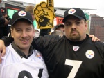 Steve and Andrew with a foam-fingered fan celebrating the win!