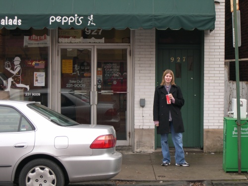 Stacey poses outside of Peppi's after our delicious meal.