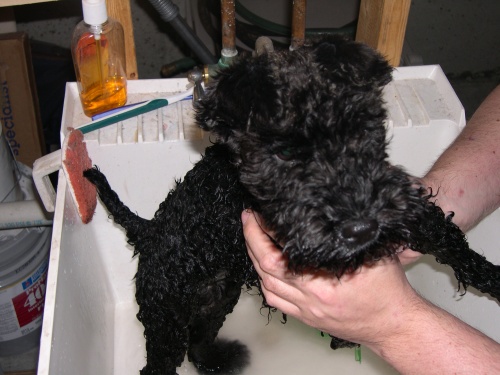 The Fleury was very well behaved in the laundry tub and let Stacey scrub her down while Andrew held her in place.