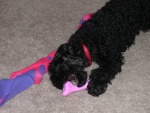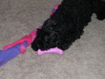 This past week, a package was delivered to Fleury Dudas. It contained new toys, including this pink rubberized bone.