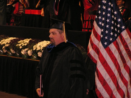 Upon descending from the stage, a complete debacle ensued as I tried to put my hat back on while the professional photographer adjusted my hood which ultimately resulted in me dropping my diploma. But, after collecting myself, I posed for this stock photograph in front of the American flag. This photo is courtesy of my co-worker, Lori Libby.