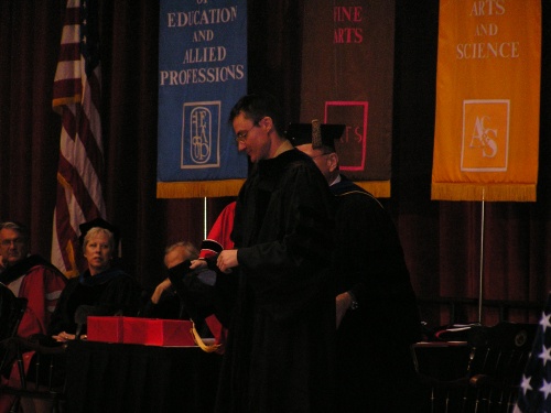 Mike prepares to be hooded by Dr. Mason. This photo is courtesy of my co-worker, Lori Libby.