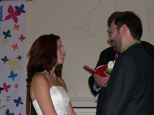 A close-up of Gregg and Jen listening to the scripture reading.